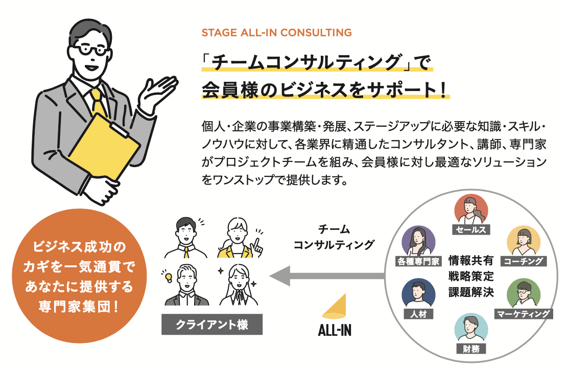 個人・企業の事業構築・発展、ステージアップに必要な知識・スキル・ノウハウに対して、各業界に精通したコンサルタント、講師、専門家がプロジェクトチームを組み、会員様に対し最適なソリューションをワンストップで提供します。