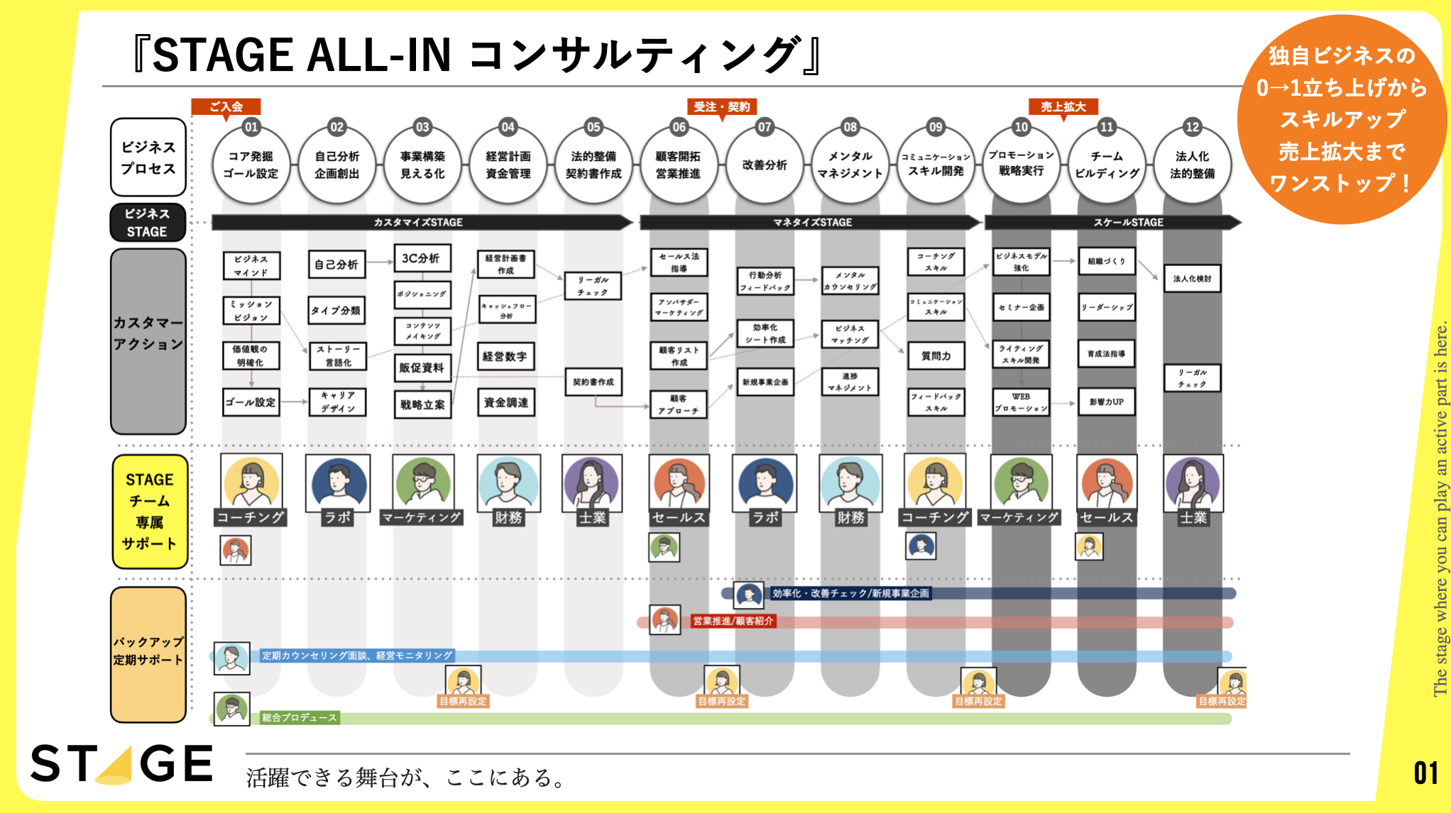 事業の立ち上げから、マネタイズ、スキルアップ、売上拡大までワンストップでサポートができる独自のコンサルティングメソッドです。